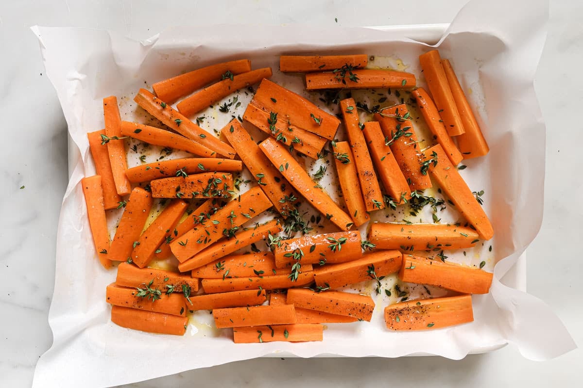 • Carrots: For best results I recommend cutting whole carrots into sticks the same size. Baby carrots don’t roast as well because you can end up with a variety of sizes in a single bag, some quite thick and some very thin. The smaller ones require a shorter cooking time than the bigger ones. The different sizes will result in uneven cooking. When you cut the carrots into sticks yourself you have control over the sizing.