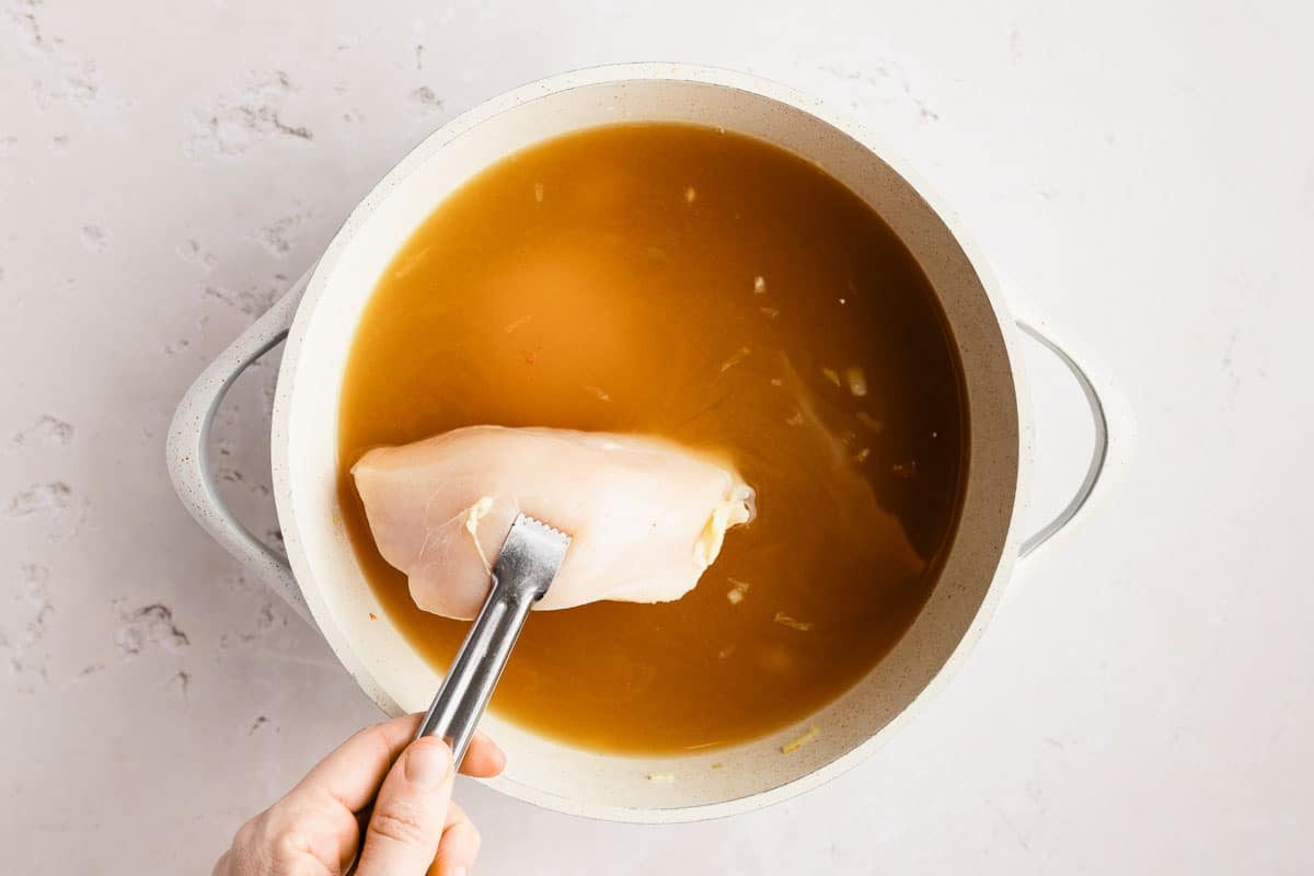 - Add chicken stock and chicken breasts. Simmer for 10 min, until chicken is cooked through. Carefully remove the chicken from the pot. Shred or chop. Add the chicken back to the soup and stir.