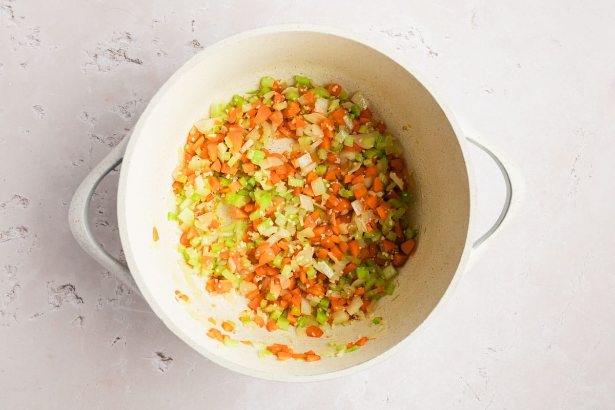 - Add oil, onion, carrots, and celery to a soup pot. Sautรฉ on medium high heat, stirring frequently, until onion is tender. Then add minced garlic and sautรฉ until golden in color, about one minute.