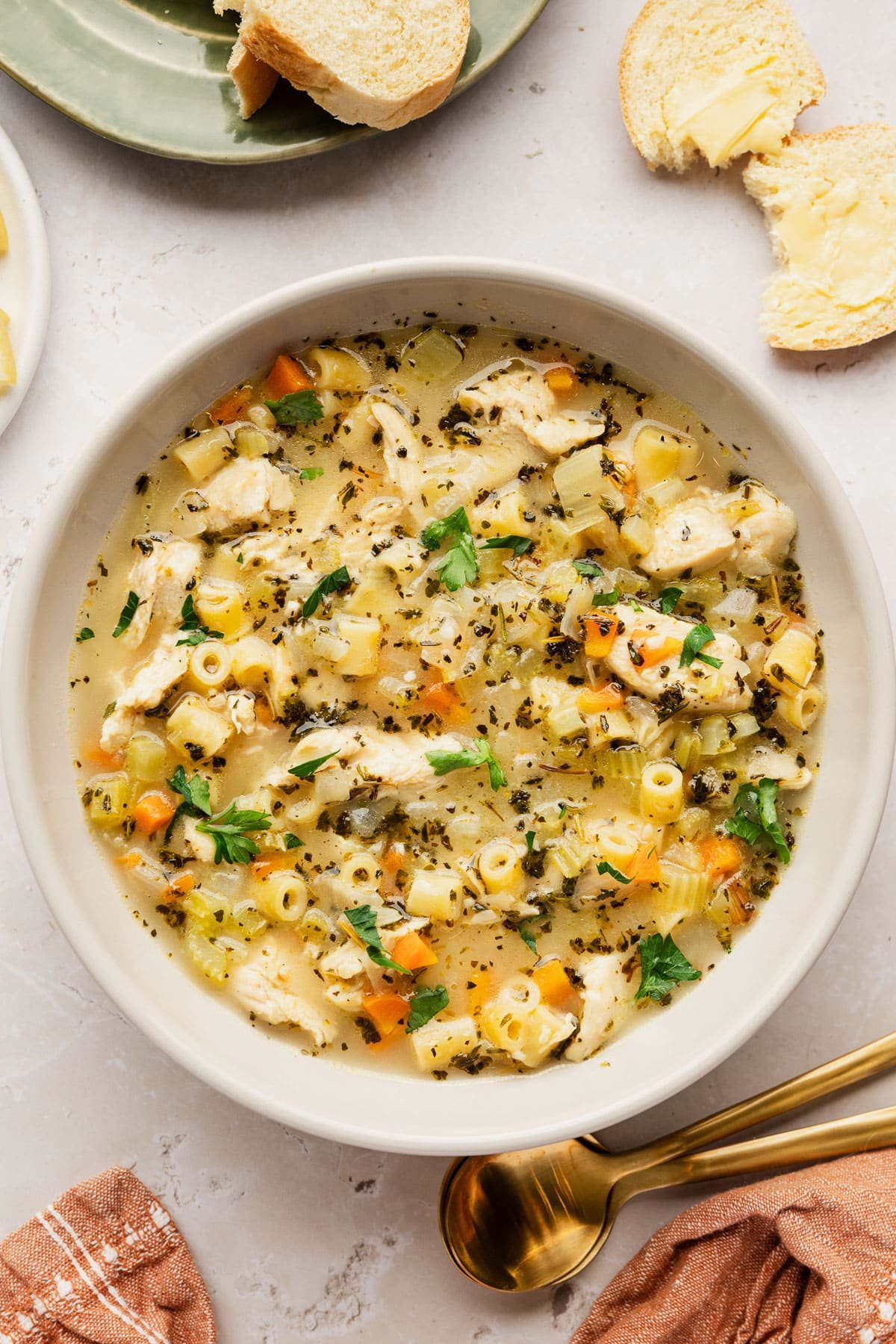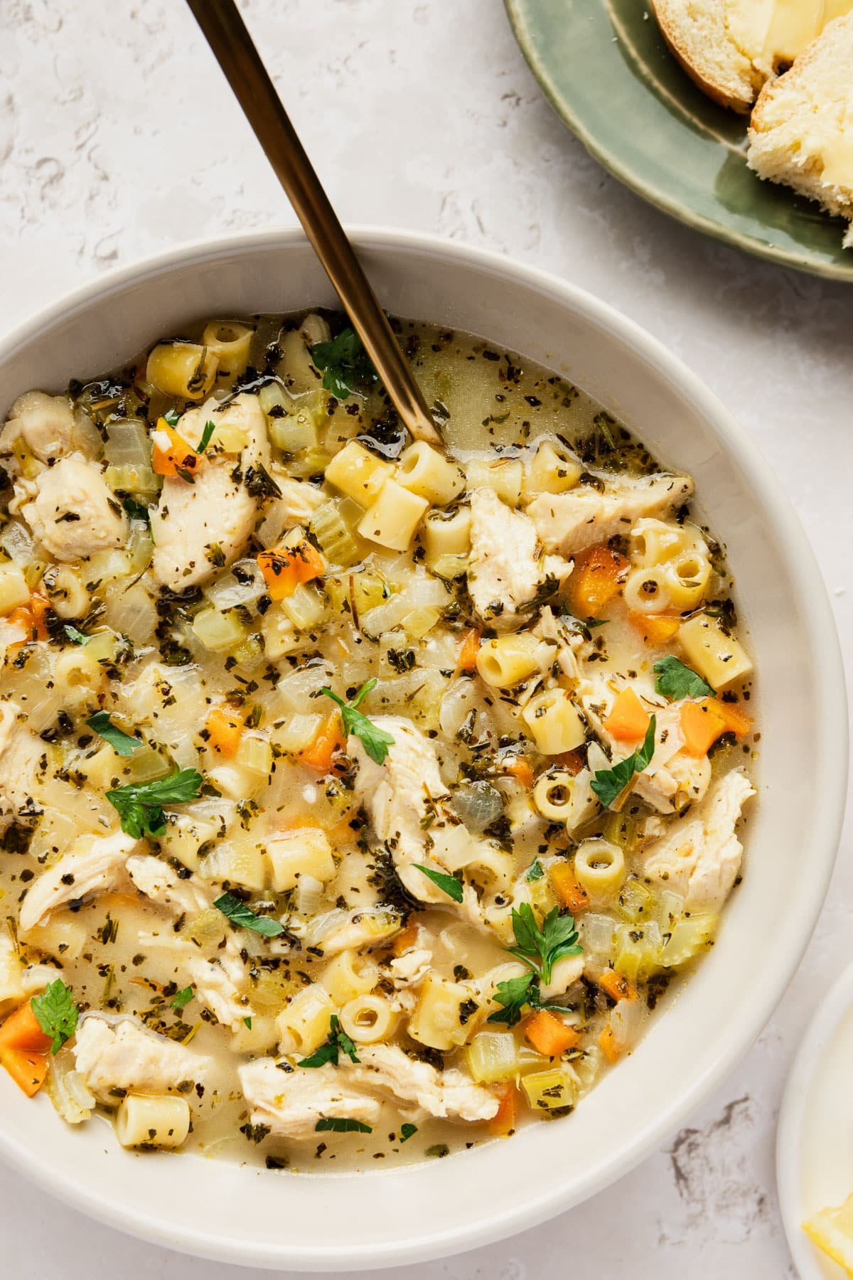 This creamy soup is a fun spin on the classic chicken noodle soup with a few tweaks to really make it extra special. Yes of course it’s loaded with tender chicken and pasta. But we’re opting for ditalini pasta instead of wide egg noodles. Ditalini pasta is small which I appreciate because it’s similar in size to our other ingredients. This means more balance and flavor in every bite! Another fun change is the addition of flour, milk, and parmesan to thicken our broth a bit. That creamy texture feels oh so cozy.