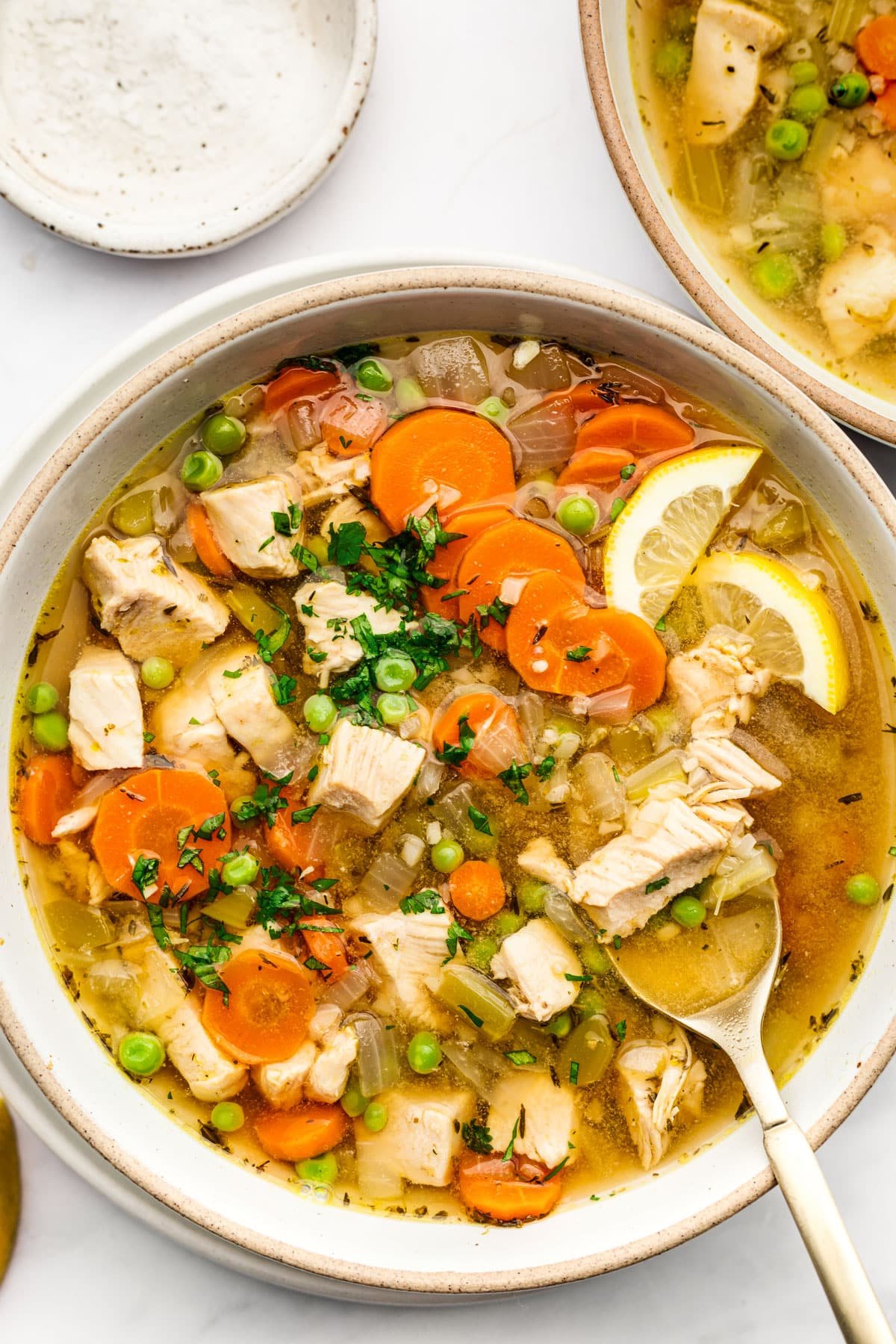Stir in the cauliflower and peas. Riced cauliflower and peas require very little cooking so we don’t want to add them too soon. Simmer for another 5 to 10 minutes or until chicken is cooked through and veggies are all tender. Ladle into bowls with chopped fresh parsley. I recommend serving crusty bread with each bowl of soup. Guess what the next step is? Eat! The entire family will approve of this delicious dish!