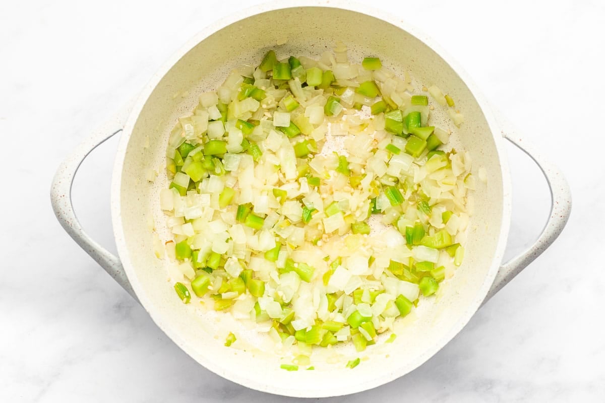- Add your olive oil, onion, celery, and garlic to your soup pot. Sautรฉ on medium high heat, stirring frequently, until onion is tender and the garlic has a bit of browning.