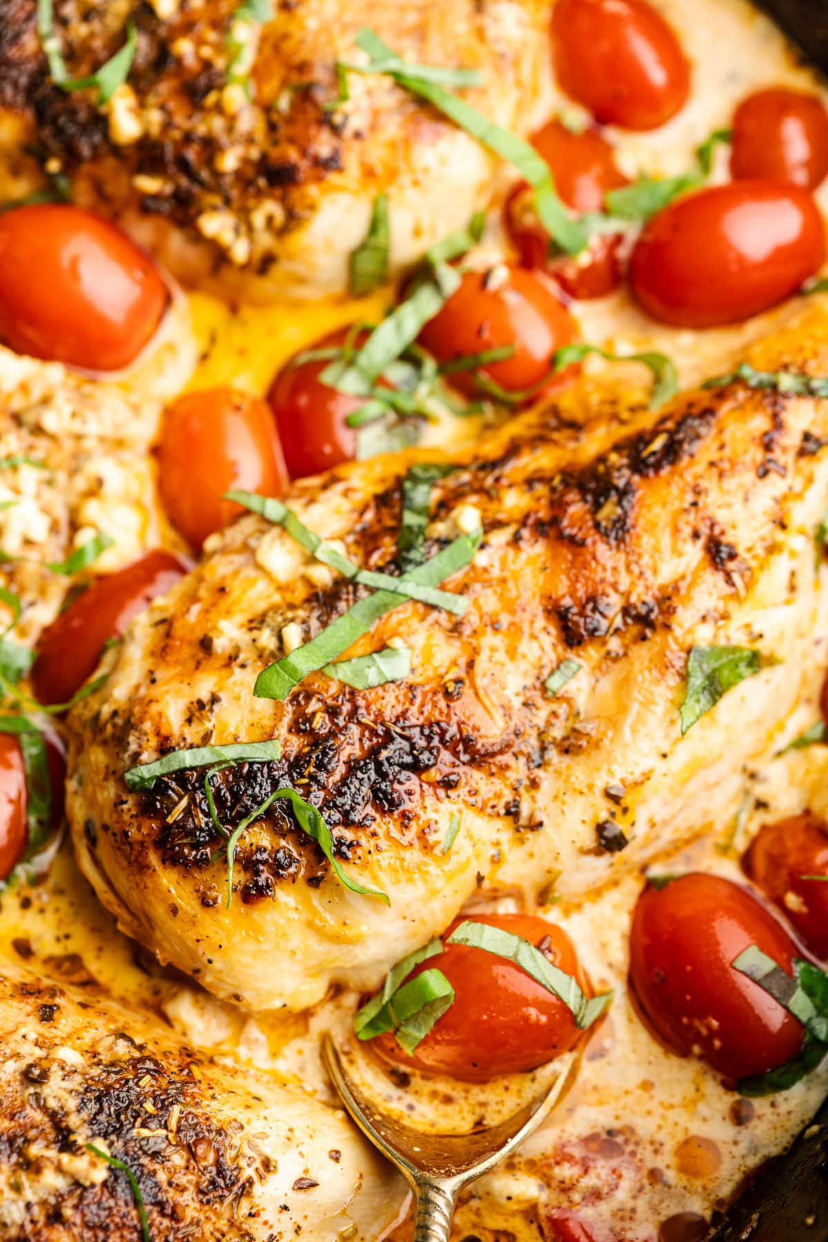- Remove chicken from skillet and set aside. Use a fork or spoon to stir the feta and tomatoes into the sauce. Add the chicken back to the skillet and spoon sauce over top. Top everything with thinly sliced fresh basil.