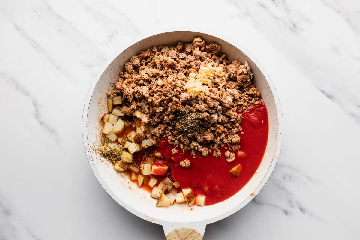 - Reduce heat to medium. Add your cooked ground turkey, tomato sauce, water, minced garlic, oregano, basil, parsley, salt, pepper, and onion powder to the skillet with potatoes. Cover and simmer for 5 minutes, or until potatoes are tender.