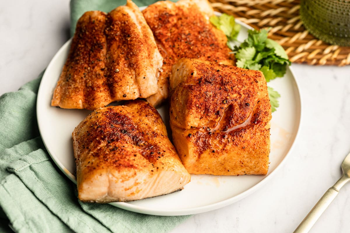 Yes! Before seasoning the fillets, add them to the air fryer while they’re still frozen. Cook for 6 minutes. This will thaw out your salmon. After the 6 minutes are up, add the seasonings to the top and follow the recipe from there. Total cooking time if using frozen salmon will be 13 to 16 minutes because of the 6 additional minutes in the air fryer to thaw.