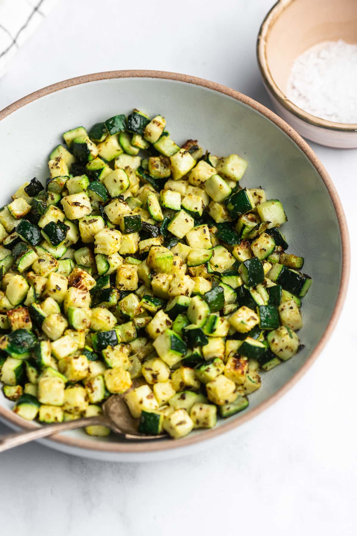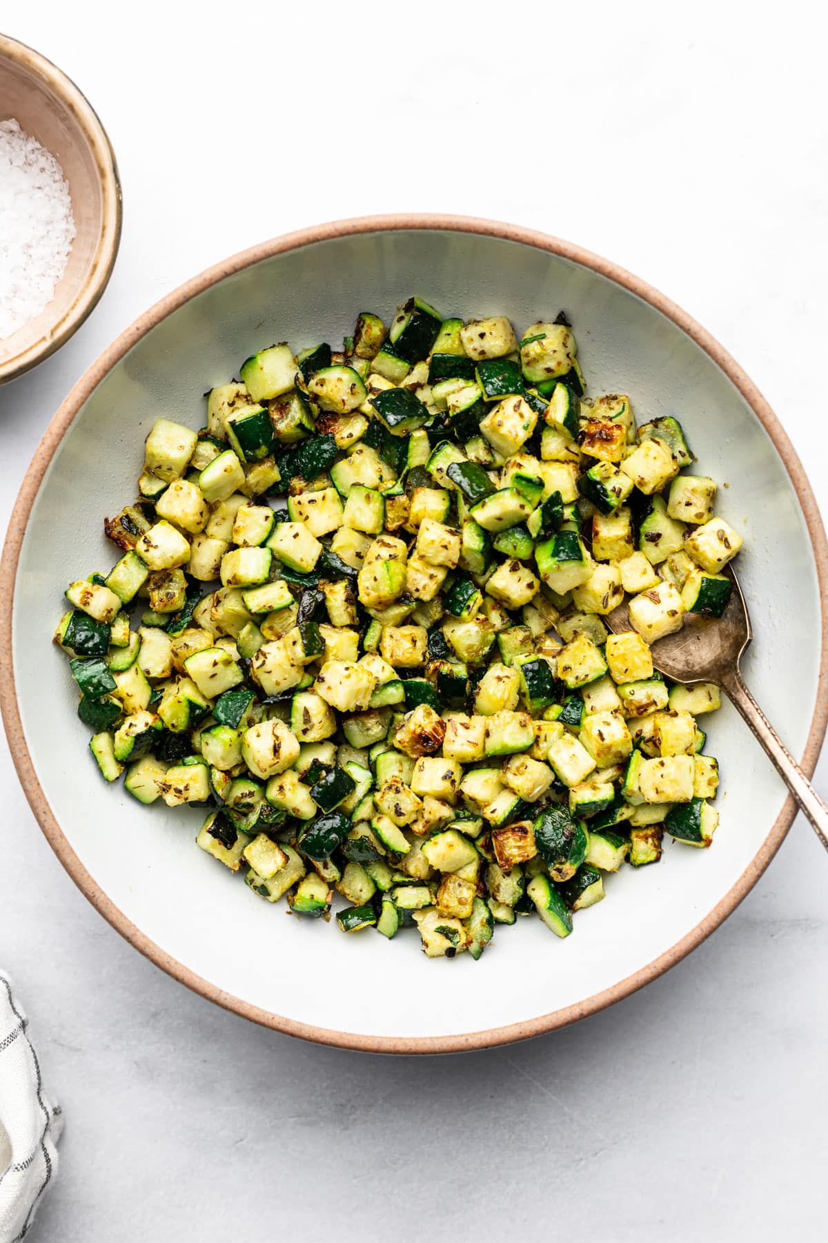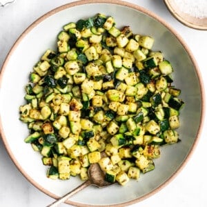 The finished zucchini will be perfectly tender and tasty. You’ll see some golden brown pieces in there too! Enjoy as is or switch things up by topping with parmesan cheese, nutritional yeast, or italian seasoning.