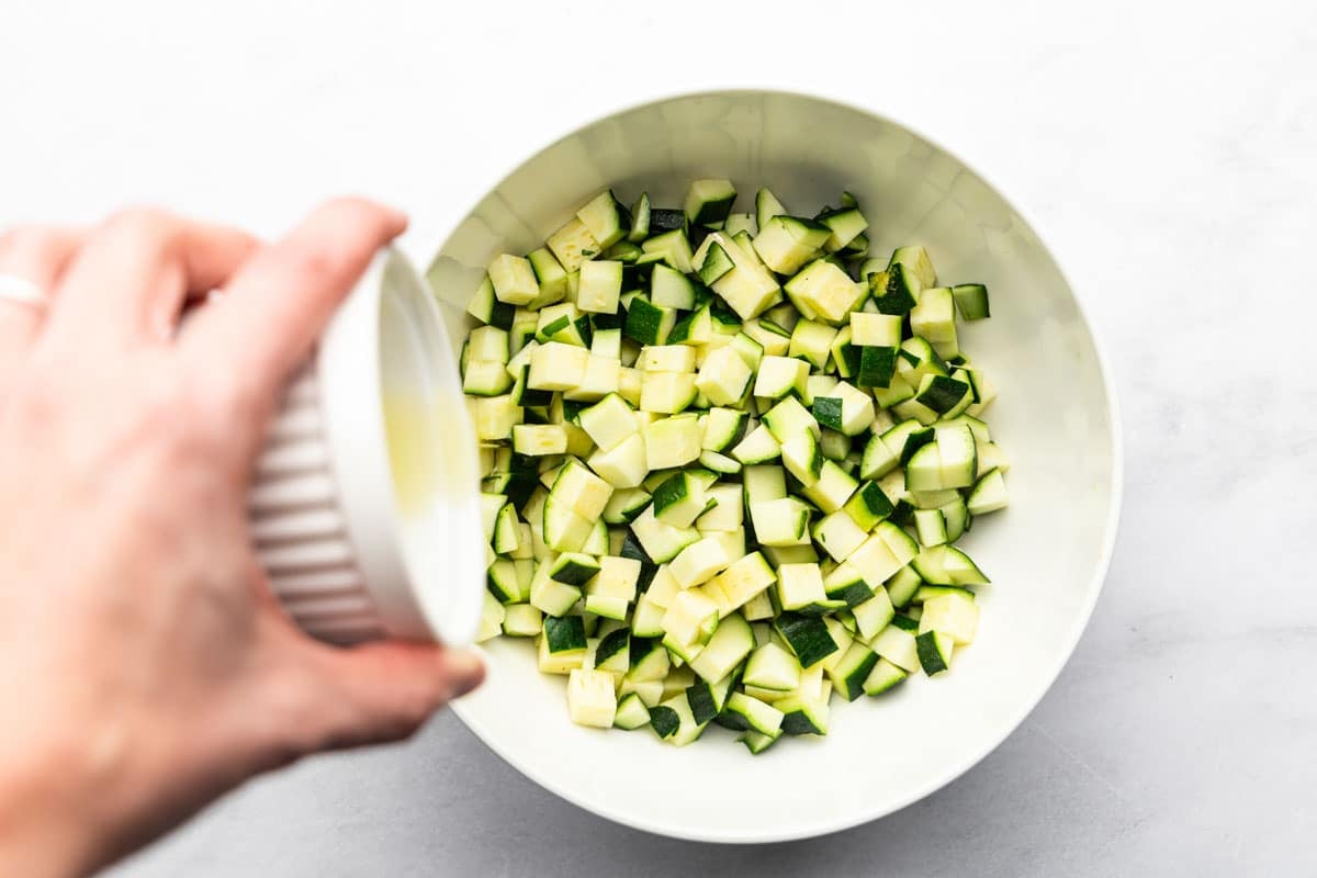 To flavor the zucchini, simply dice them and toss them in a mix of olive oil and seasonings. Be sure to dice them the same size so theyโll all cook in the same amount of time.