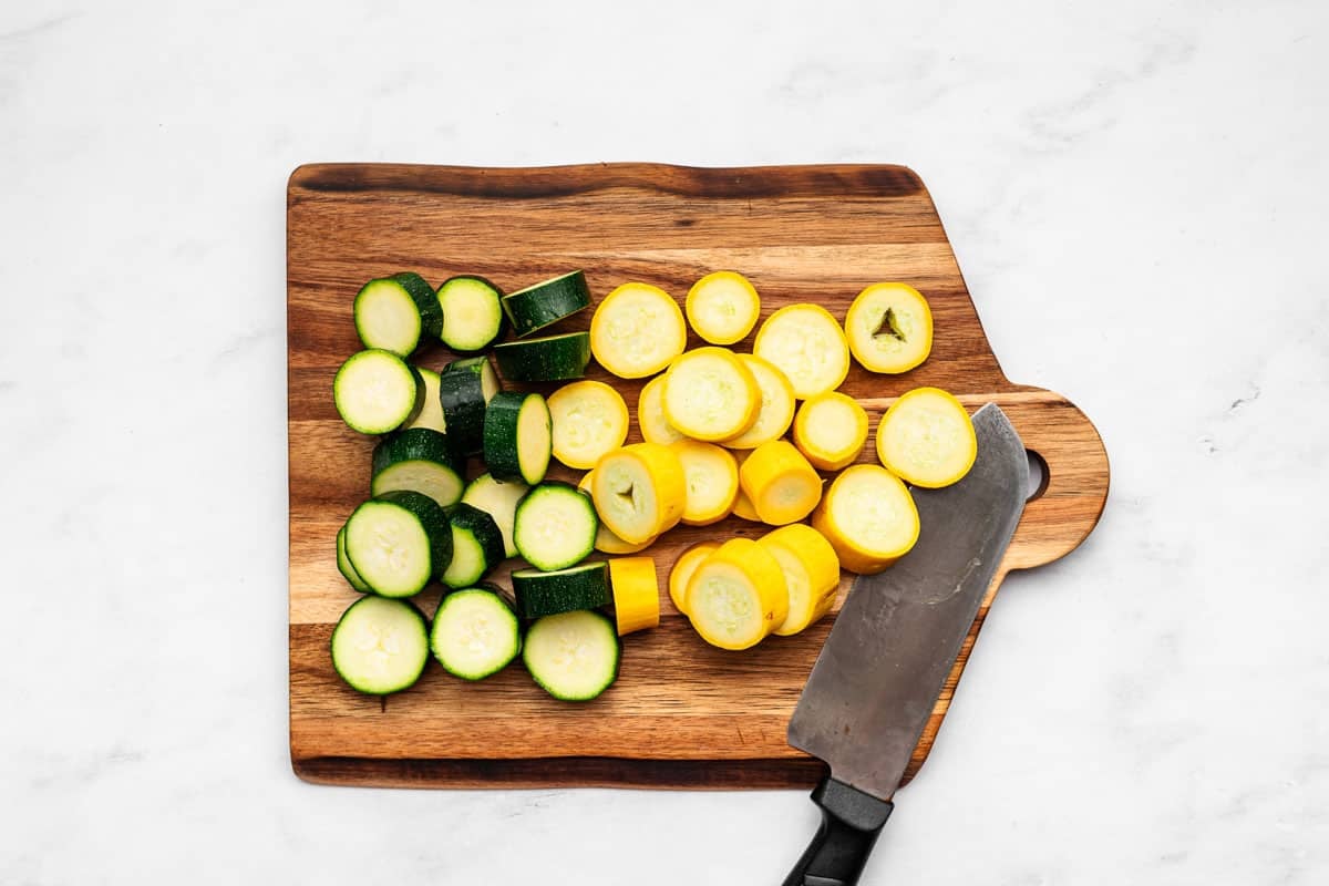 While I most often choose to slice my zucchini and squash into circles, you can certainly do squash and zucchini spears if you prefer. This means you’ll trim to ends of your veggies. Then slice vertically into strips. They cook in relatively the same amount of time.