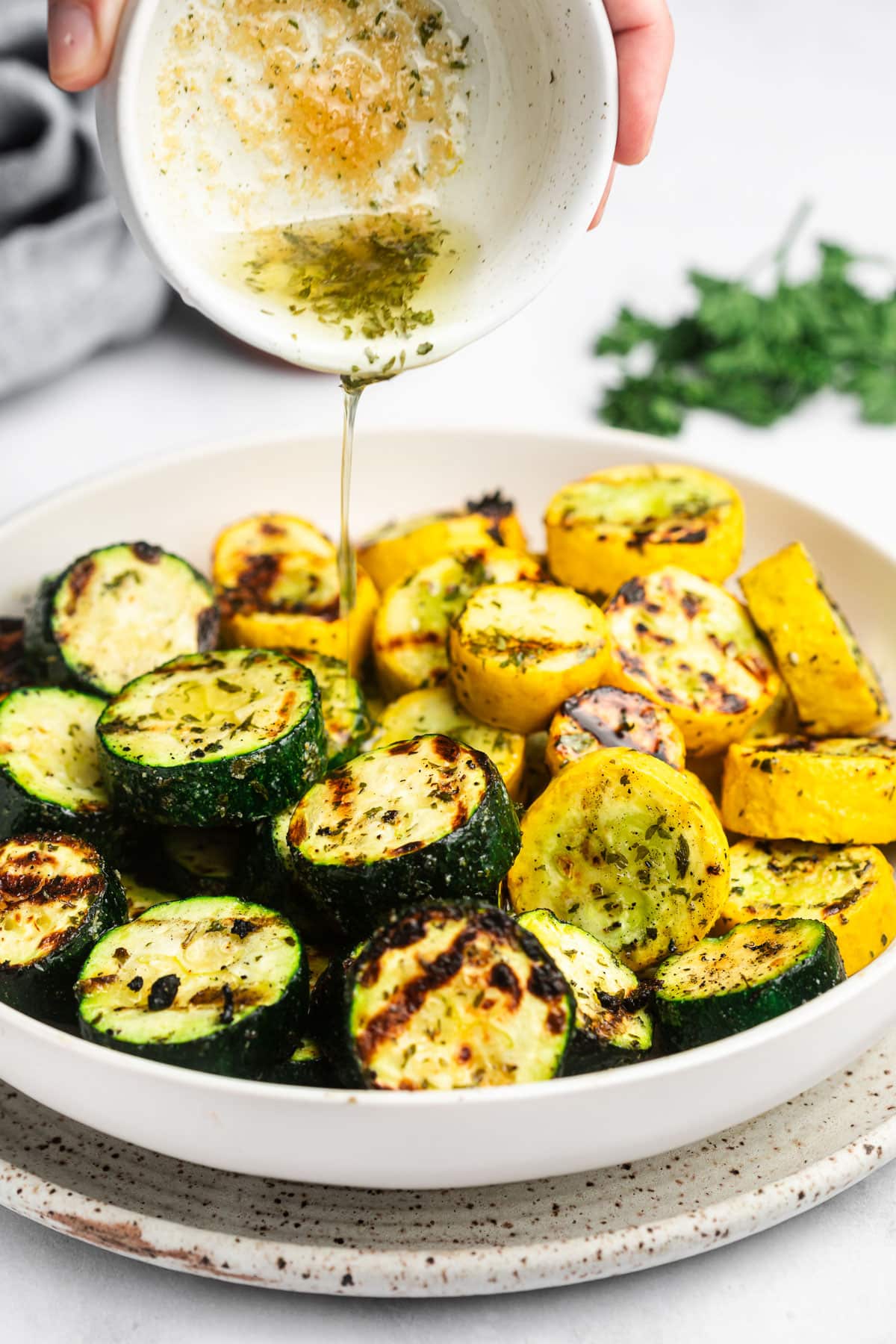 - Remove from grill and plate. Drizzle remaining oil/herb/seasoning mixture over your grilled zucchini and squash.