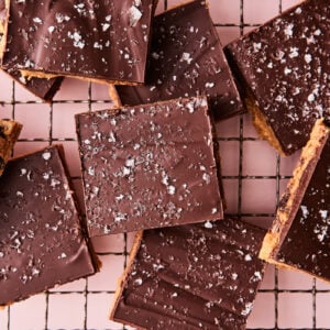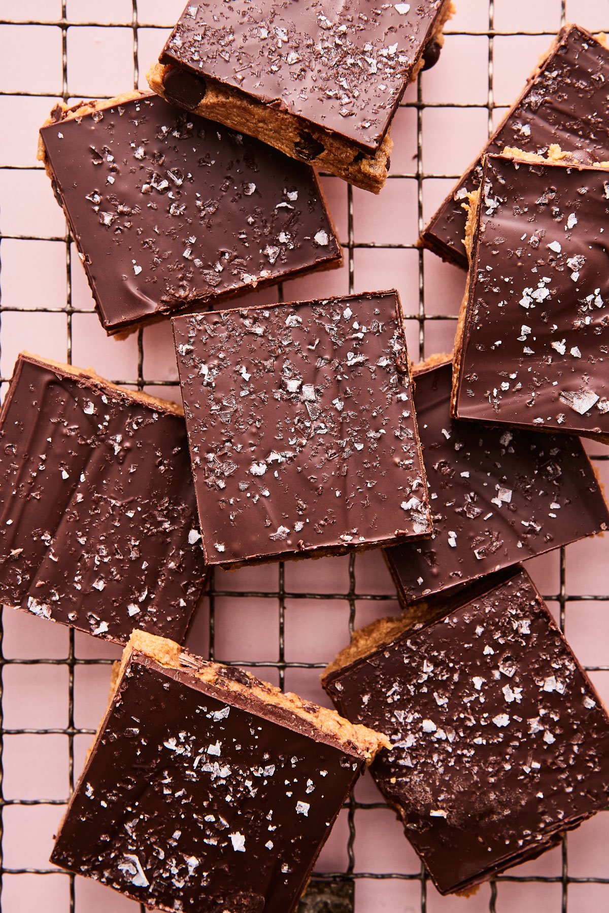 After pressing the finished cookie dough into bars we’re topping them with melty chocolate and flaky salt. I’m telling you this dessert will blow your mind.