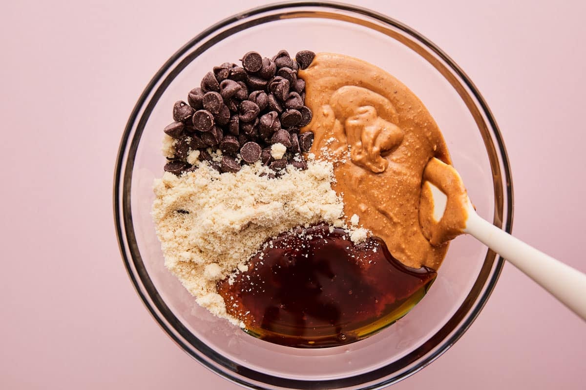 - In a large bowl stir together the almond flour, nut butter, honey or maple syrup, vanilla, and chocolate chips or chunks. Spread in a single layer in a parchment paper lined 8 x 8 baking dish.