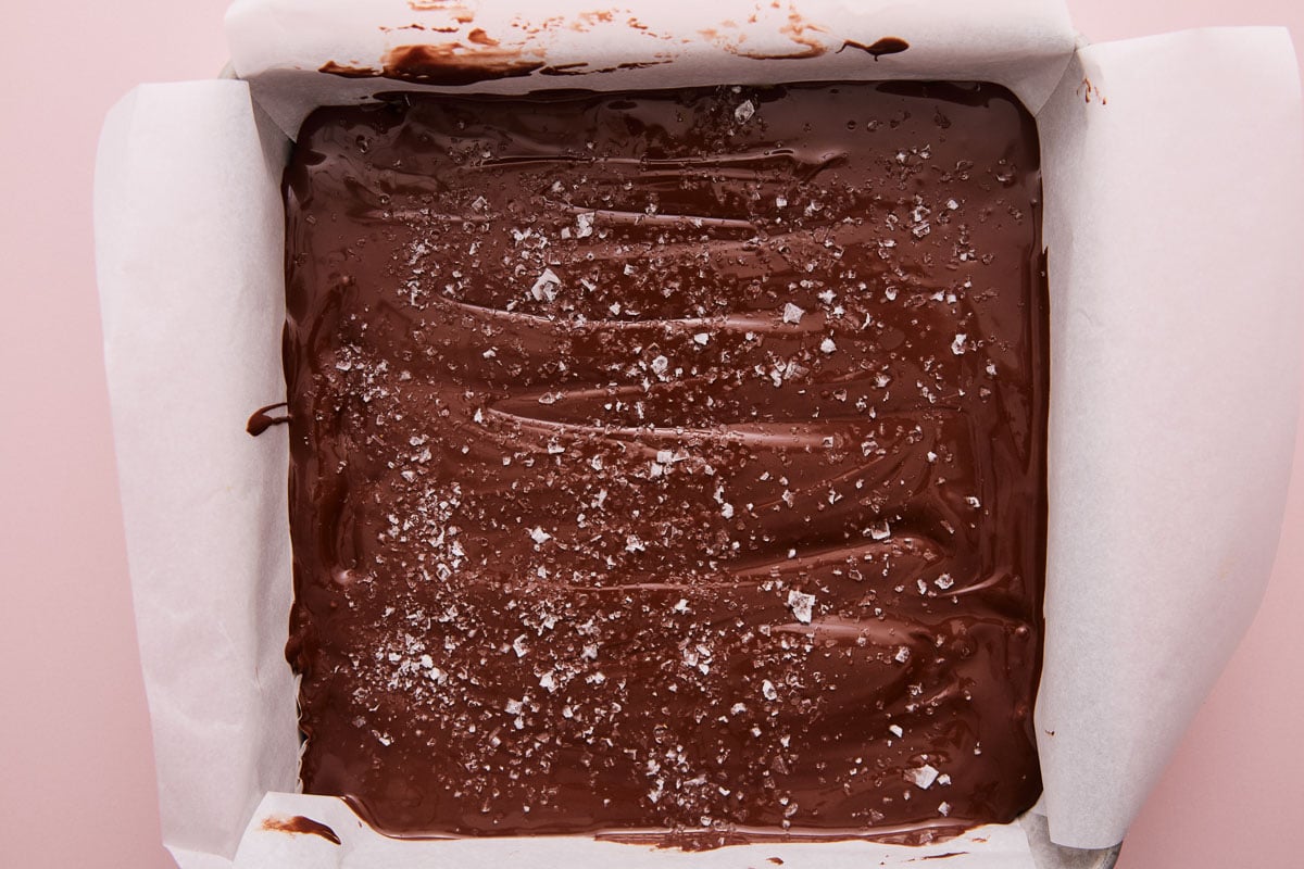 - Pour melted chocolate over the cookie dough. Use a spatula to spread it out so it's in an even layer. Sprinkle with sea salt flakes. (Can omit but it adds so much flavor so I recommend not skipping this step!)