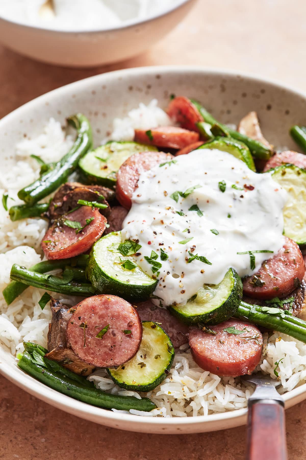 How to Make Sausage and Veggie Bowls with Creamy Yogurt Sauce