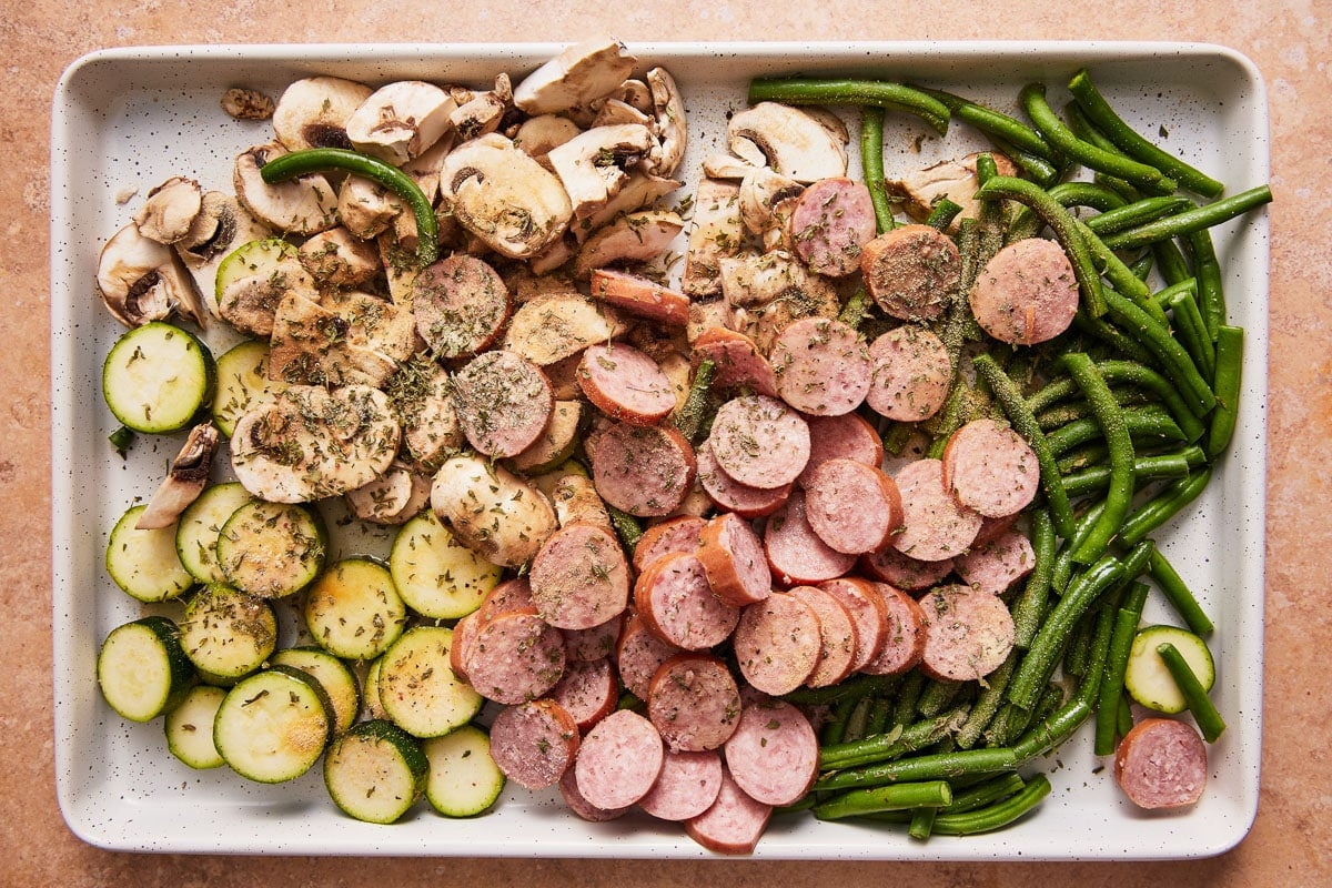 - Spread the sausage, zucchini, green beans, and mushrooms on the baking sheet. Drizzle with oil. Sprinkle dried parsley, garlic powder, onion powder, salt, and pepper over everything. Stir so everything is well seasoned. Spread sausage and veggies in a single layer after stirring.