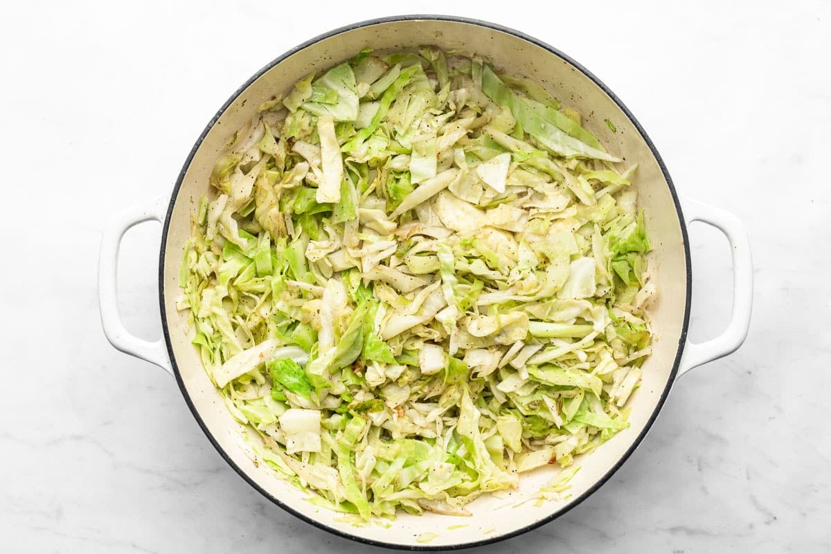 Add the shredded raw cabbage, salt, pepper, and crushed red pepper flakes (optional). When you first add the cabbage it will completely fill the pan and you may wonder how it will all fit. Don’t worry, it will! Just stir it occasionally as it cooks. It wilts and becomes perfectly tender.