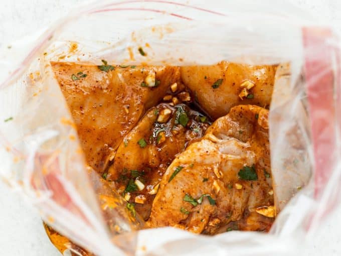 - In a gallon Ziploc bag or large covered bowl combine chicken and all marinade ingredients. Let marinade for a minimum of 1 hour or as long as 12 hours. (The longer the better to really bring out the lime flavor.)
