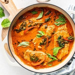 Sautéed Chicken in Creamy Red Pepper Sauce is so incredibly flavorful but simple. Serve it over noodles, zoodles, spaghetti squash or with roasted veggies!