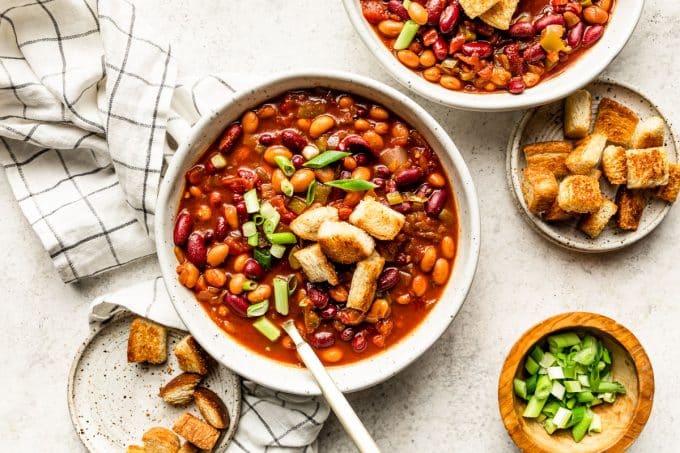 My favorite way to enjoy this hearty chili is with a handful ofย Homemade Croutonsย on top. That buttery (they donโt have actual butter in them) crunch is perfection with the flavors in the chili. Crushed tortilla chips or fritos are delicious too!