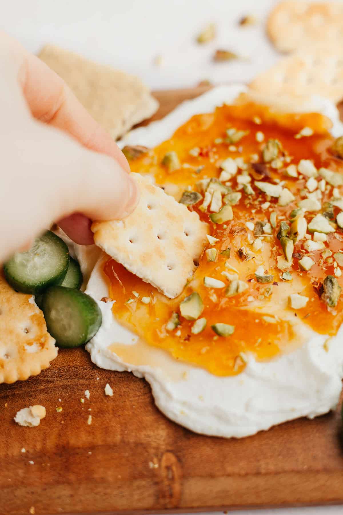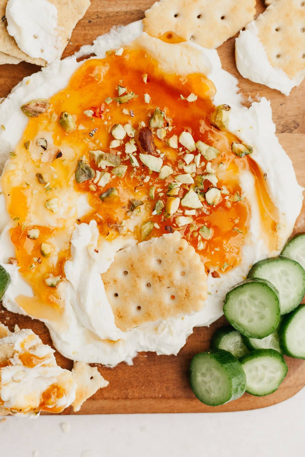 Creamy goat cheese, sweet apricot preserves, spicy hot honey, and crunchy pistachios are all you need for this simple but totally delicious appetizer.