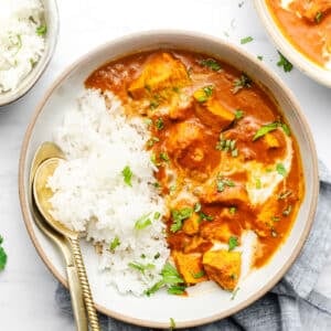 Scoop ½ cup of the solidified cream from the top of a can of coconut milk or coconut cream. Stir into your butter chicken. Garnish with chopped cilantro and a drizzle of coconut milk (optional) when serving. Ladle over white rice or cauliflower rice.